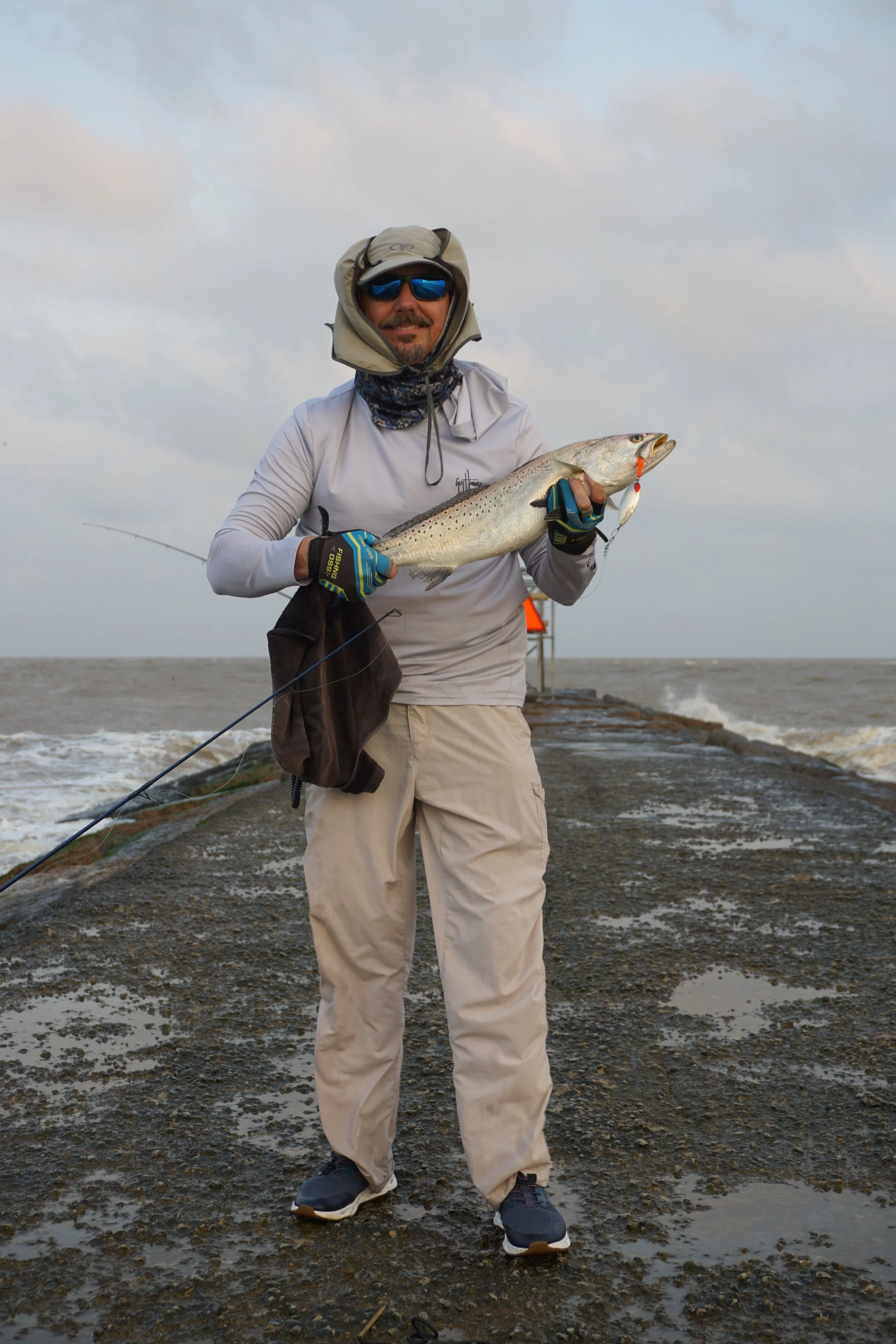 Oversized Trout caught on the Galveston Jetty with a Spoon.